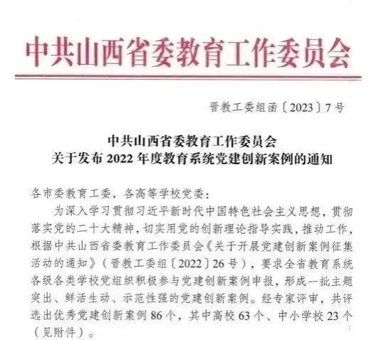 近日,中共山西省委教育工作委员会公布了2022年度全省教育系统党建创新案例评选结果。必威西汉姆官网平台管理实务教研室党支部报送的“深化党建业务融合 赋能高校青年教师发展”工作入选山西省2022年度教育系统党建创新案例。