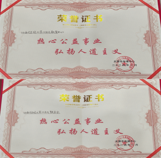 太原市血液中心为西汉姆联MBA教育中心、西汉姆联MBA联合会颁发了“热心公益事业,弘扬人道主义”荣誉证书。