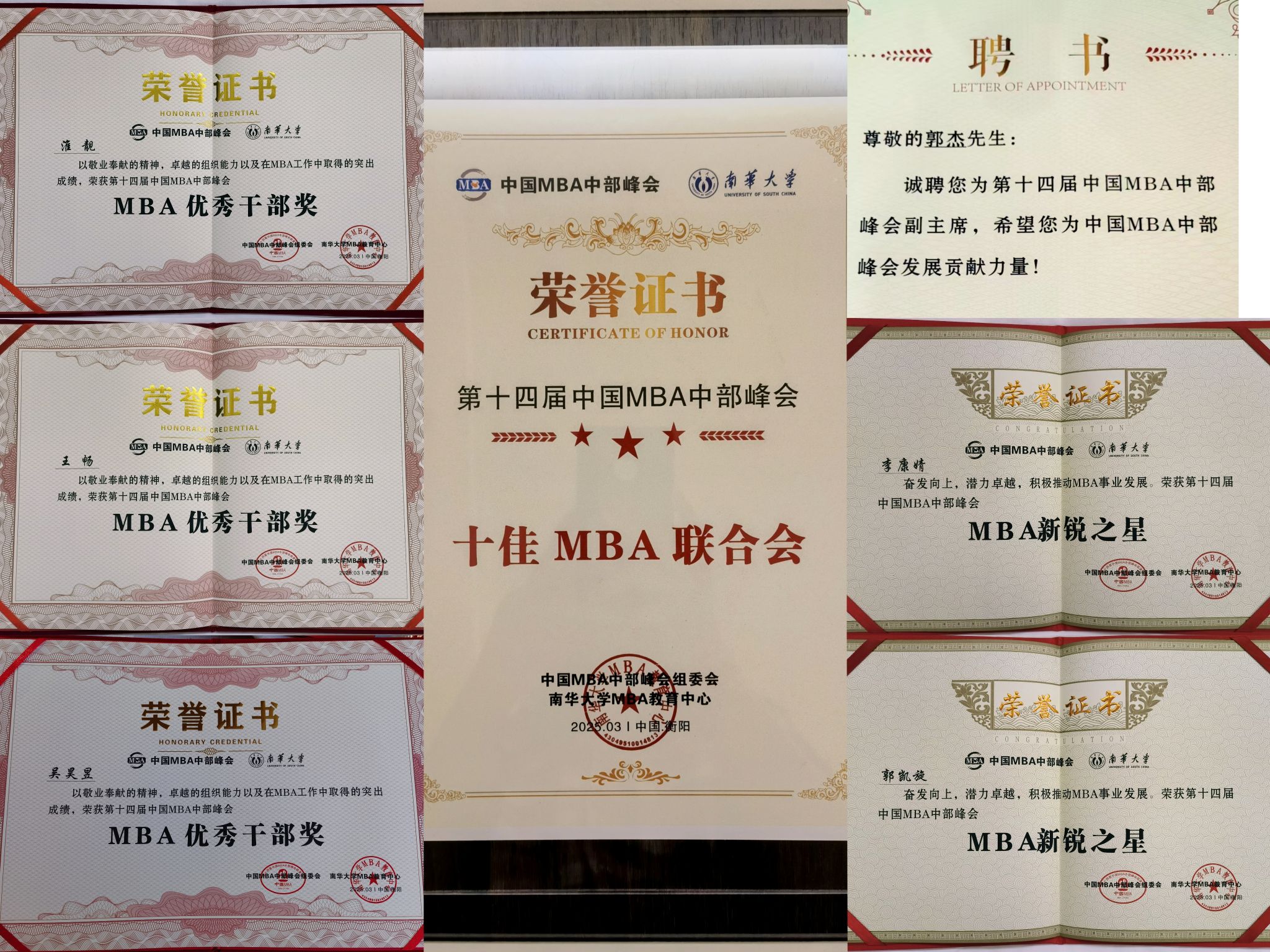 会上,我院第十九届MBA联合会获得“十佳联合会”称号,联合会主席郭杰当选第十四届中国MBA中部峰会副主席,联合会吴昊昱、淮靓、王畅获评“十佳MBA优秀干部”,MBA学生郭凯旋、李康婧获得“MBA新锐之星”。