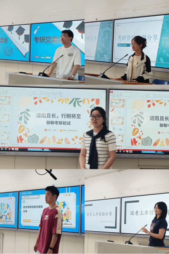 经验分享环节,五位优秀毕业生代表分别结合自身求职、考研经历,先后就国家公务员入职笔试与面试、民营企业求职经历、考研院校选择、求职考研心态调试等问题展开了经验分享。梁彦清老师围绕学硕与专硕选择、报考策略与备考方法、专业学习与考研复习等问题作了详细交流。金春丽老师结合近三年就业、考研数据,分析了当前就业形势与考研形势。