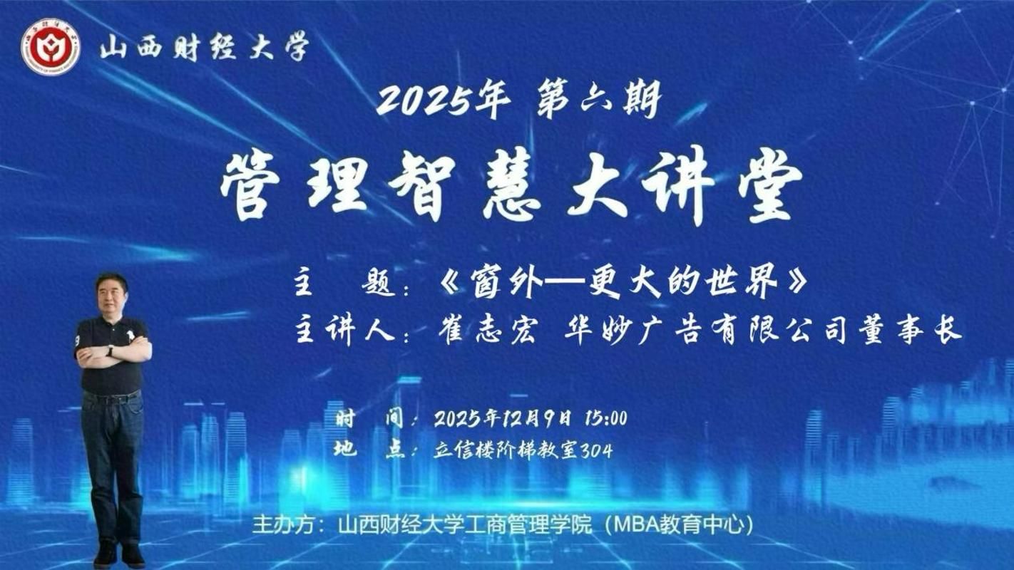 12月9日下午,必威西汉姆官网平台“管理智慧大讲堂”2025年第六期在立信楼阶梯教室304成功举办。我院优秀校友、MBA校外导师、太原市华妙广告有限公司董事长崔志宏先生应邀作题为《窗外——更大的世界》的专题讲座。学院2024级200余名同学参加了本次讲座。本次讲座由学院党委副书记周志刚主持。