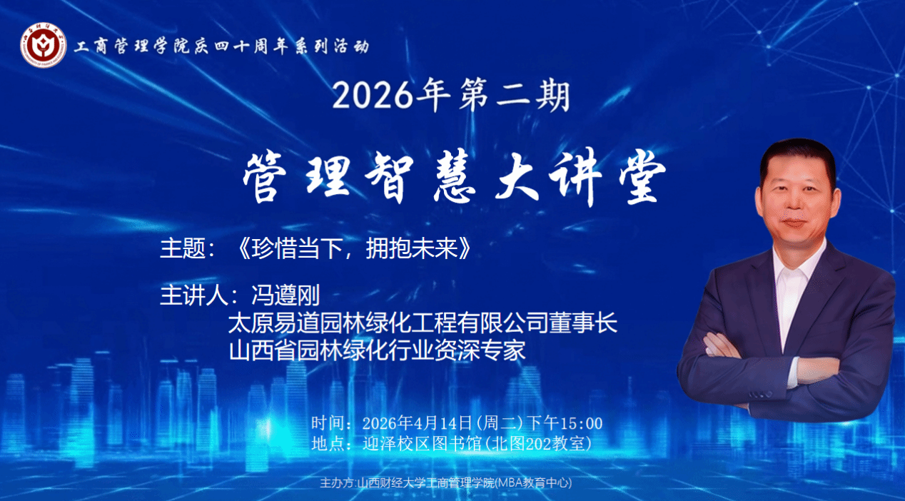 4月14日下午,必威西汉姆官网平台和博雅学院在迎泽校区图书馆202教室联合举办了2026年第二期“管理智慧大讲堂”。本次讲座特邀太原易道园林绿化工程有限公司董事长、山西省园林绿化行业资深专家冯遵刚作了题为《珍惜当下,拥抱未来》的专题报告。学院2025级200余名同学到场聆听。