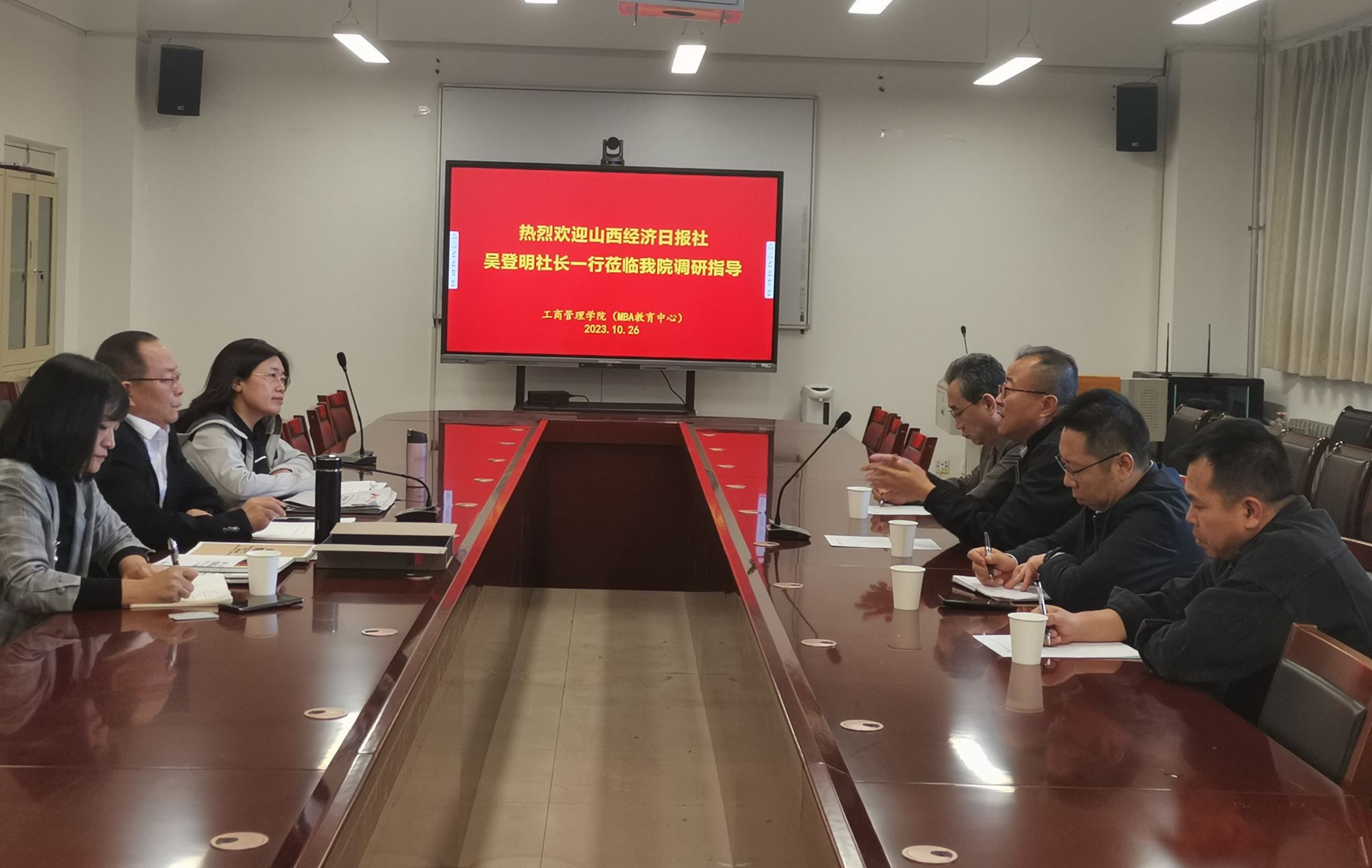 10月26日下午,山西经济日报社社长吴登明、副总编甄宝全等一行4人莅临我院调研指导。我院院长卫虎林、副院长薛继东、管理原理教研室主任张莉艳等参加了本次会议。座谈会由卫虎林院长主持。