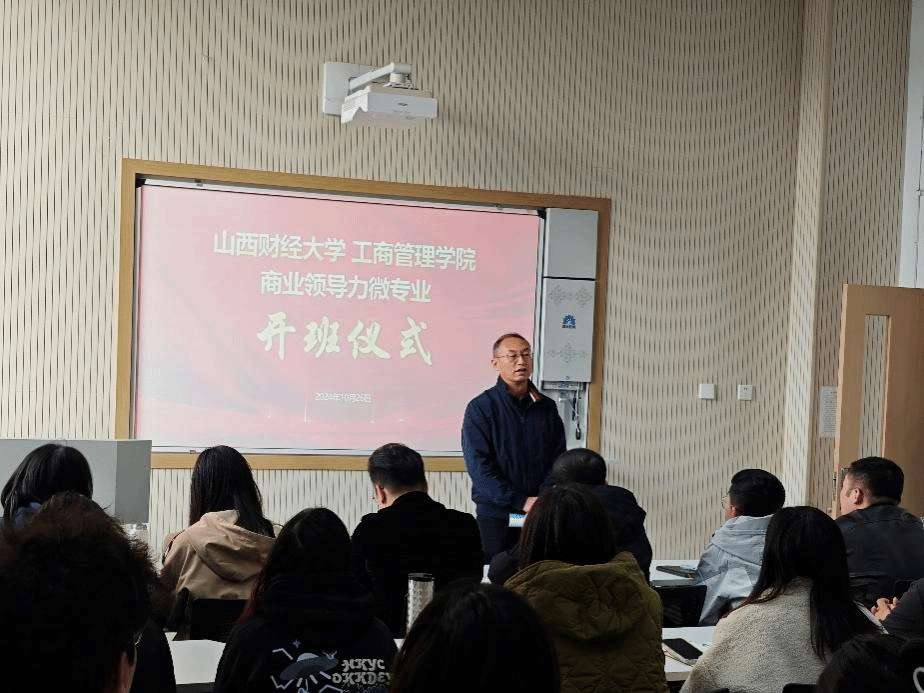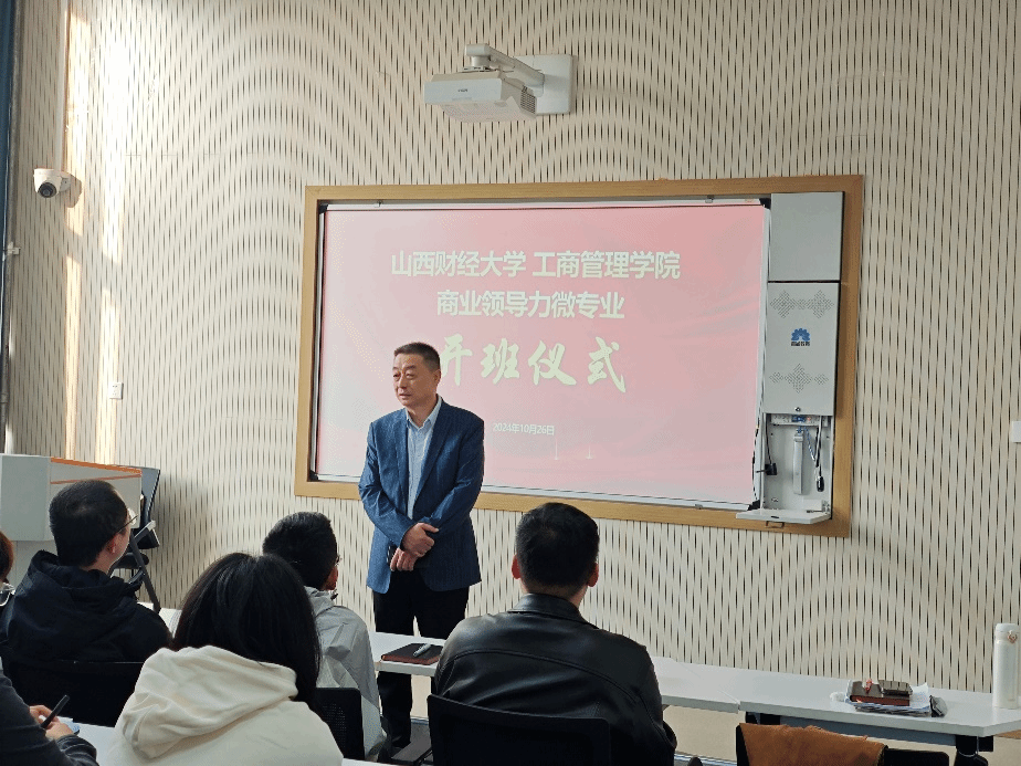 10月26日上午,我院“商业领导力”微专业在修德楼205教室正式开班,并举行开班仪式。该微专业是按照学校统一部署,我院秉承教育部“新文科”教育理念,聚焦“数智化+晋商精神+领导力”的融合,紧密围绕“数智化发展”与“创新驱动发展”的国家战略需求,结合数智化转型时代下管理学的前沿理论与实践,以培养具有前瞻性和创新性的商业领导者为目标开设的。依托该微专业,我院与山西省经济建设投资集团有限公司(以下简称“经建投”)携手,双方整合优势资源,互利共赢。经建投为选修微专业的在校大学生提供实习实践平台,为学生提供针对性的实践指导。我院为经建投提供企业管理咨询与理论指导,共享教育资源,提高企业员工解决实际问题的能力。