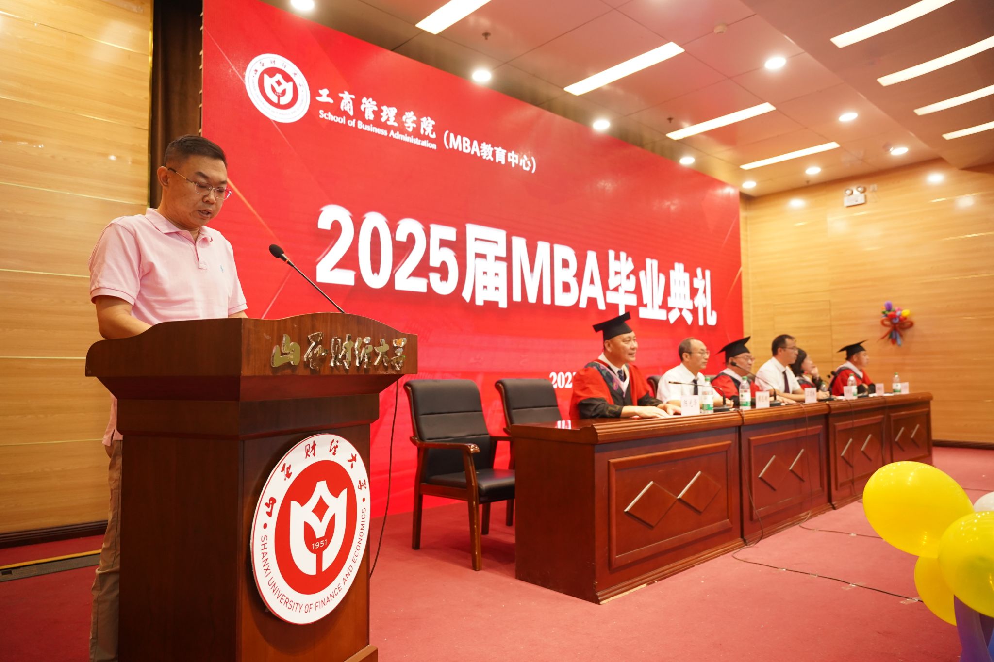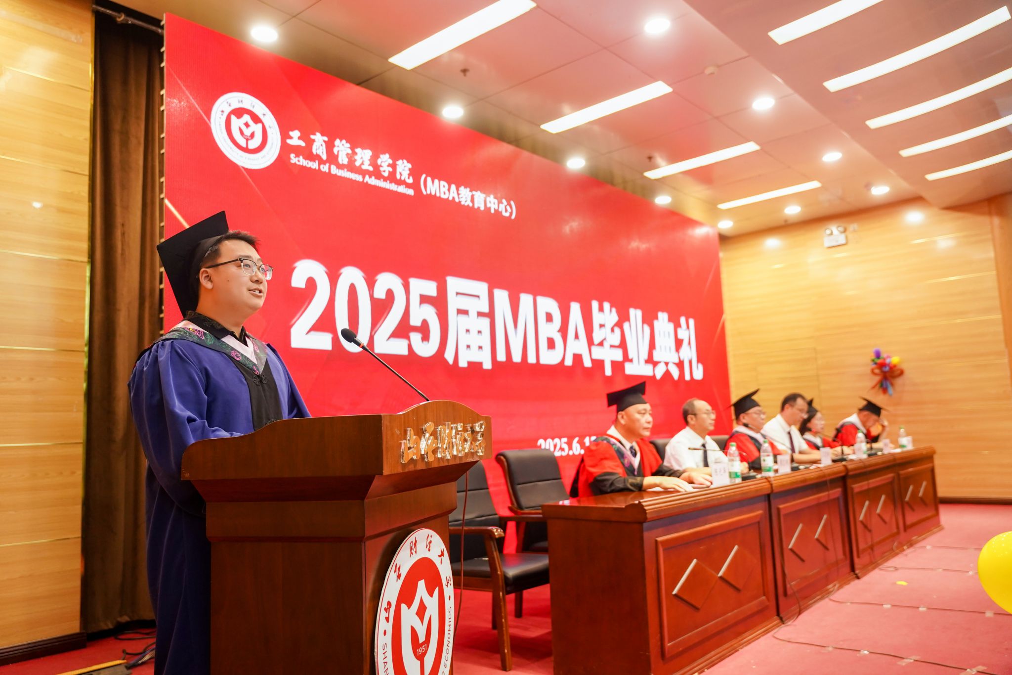 伴随着慷慨激昂的国歌,典礼正式拉开帷幕。学院院长卫虎林教授首先致辞,对2025届207名MBA毕业生顺利完成学业表示祝贺,对18位校级优秀毕业生和22位院级优秀毕业生表示肯定。他回顾了我校MBA教育项目二十五载发展历程中在人才培养、必威betway、服务社会等方面的成绩,向毕业生提出四点期望:一是以晋商精神立心,做转型发展开拓者;二是以校训精神立身,做终身学习践行者;三是以责任担当立行,做社会价值创造者;四是以家国情怀立命,做新时代奋斗者。最后,卫院长深情嘱托毕业生铭记“只要想念就会相见”的约定,祝愿大家在工作中劈波斩浪、勇毅前行。