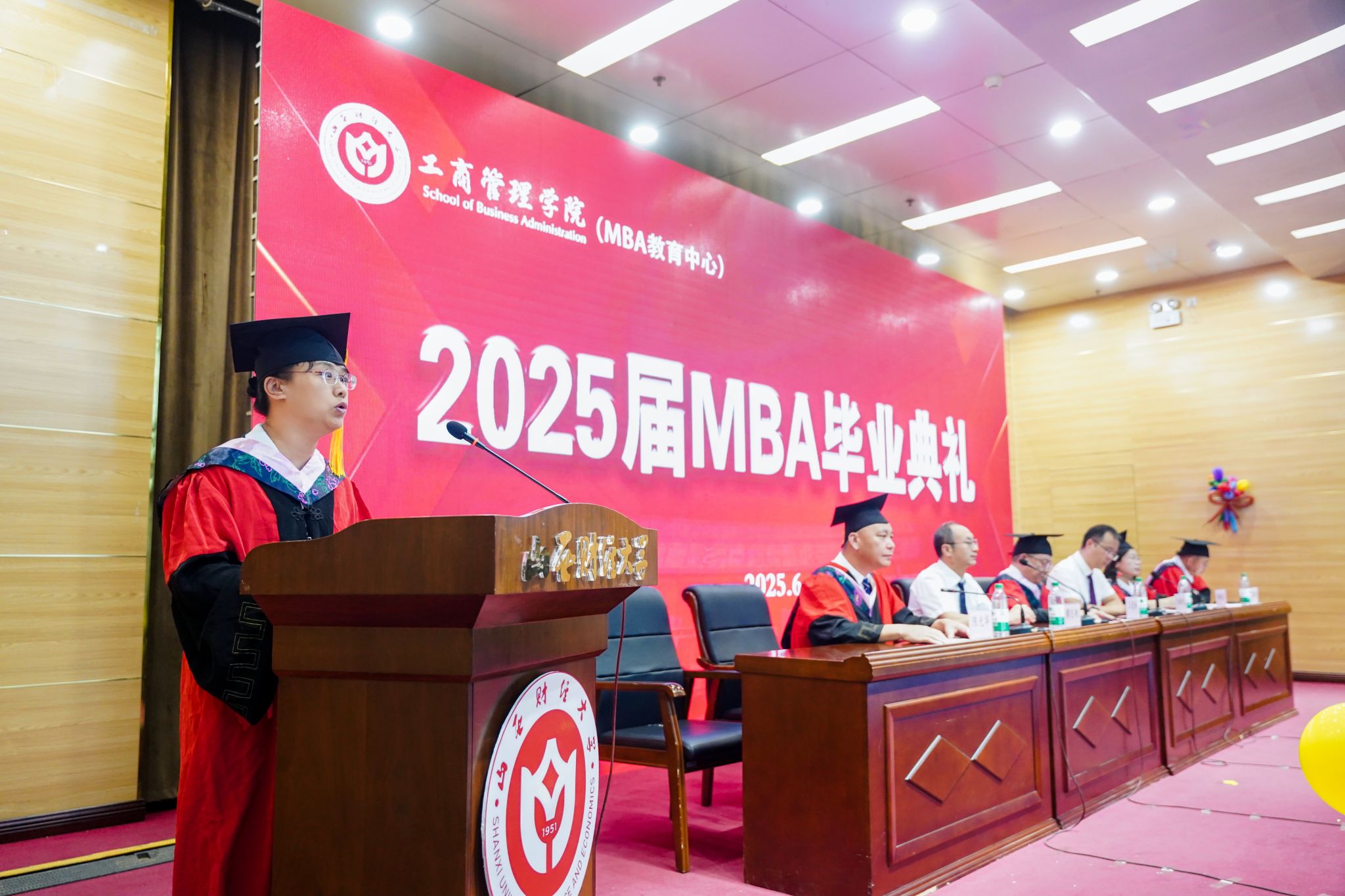 随后,学院党委副书记周志刚宣读2025届MBA毕业生名单,副院长薛继东宣读优秀毕业生名单,副院长齐永智宣读校友联络员聘任决定。校友代表、教师代表、学生代表依次发言。