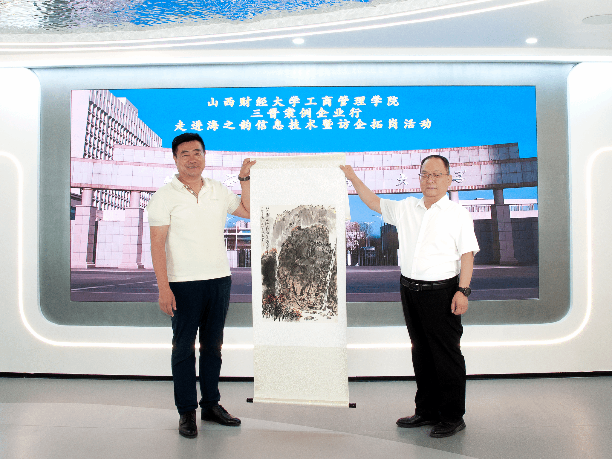 活动期间,卫虎林代表学院向公司赠送了由我院高寅博士创作的山水画《秋山图》,感谢公司全程冠名赞助前不久刚刚结束的第二届“海之韵”杯山财趣味运动会。