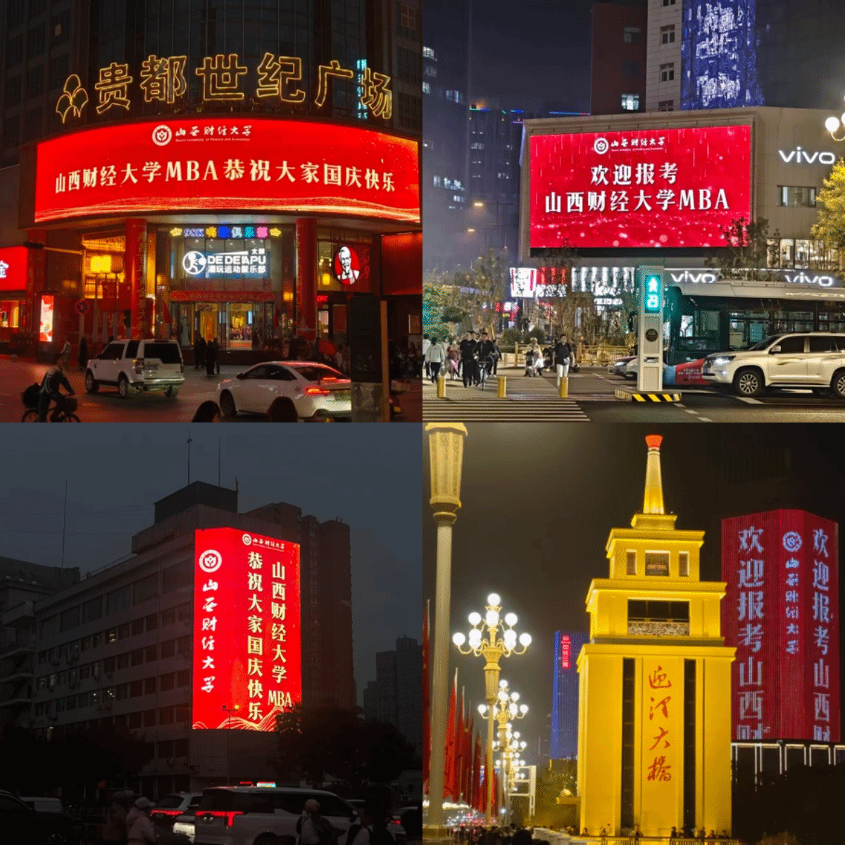 9月28日,太原市三晋第一屏——迎泽大街大南门LED大屏、太原第一商业街——柳巷贵都LED大屏、城南第一屏——亲贤街王府井百货对面LED大屏、开化寺商圈第一屏——开化寺屏、平阳路气象屏等多个省城核心地标户外大屏同时点亮,滚动播出着“西汉姆联MBA恭祝大家国庆快乐”、“欢迎报考西汉姆联MBA”等温馨祝福与诚挚问候。在国庆佳节即将来临之际,鲜艳的“财大红”再次点亮龙城夜空,向社会各界送上诚挚的节日问候与祝福。