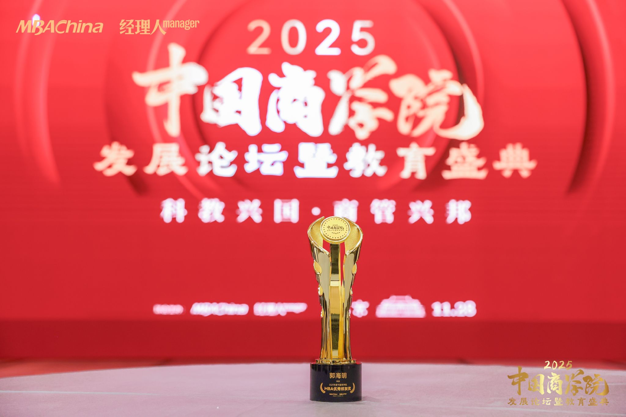 11月28日,由MBAChina与《经理人》杂志联合主办的“2025年度中国商学院发展论坛暨教育盛典”在北京成功举办。本次盛典以“科教兴国 商管兴邦”为主题,来自全国百余所院校的三百余位院校领导、专家学者与行业代表参加会议,共探中国商科教育的革新方向。盛典现场,备受瞩目的“2025年度中国商学院MBA项目TOP100榜单”权威发布。我院党委书记李群生、副院长薛继东和MBA校友会会长王建勤、学院校友会会长郭海明受邀出席盛典。