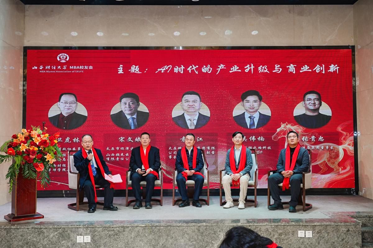 圆桌对话环节将论坛推向高潮。山西领先云天文化传媒有限责任公司总经理宋文斌、太原饮食服务集团有限公司党委副书记、副董事长、总经理袁晋江、山西丝绸之路科技有限公司 CEO吴伟楠、太斯酒店集团董事长张贵忠围绕“AI时代的产业升级与商业创新”这一主题展开了热烈而深入的对话。现场观点交锋,传媒、餐饮、科技、酒店等不同领域的思想充分碰撞,金句频出,充分展现了山财MBA校友的深厚积淀与前瞻思考。