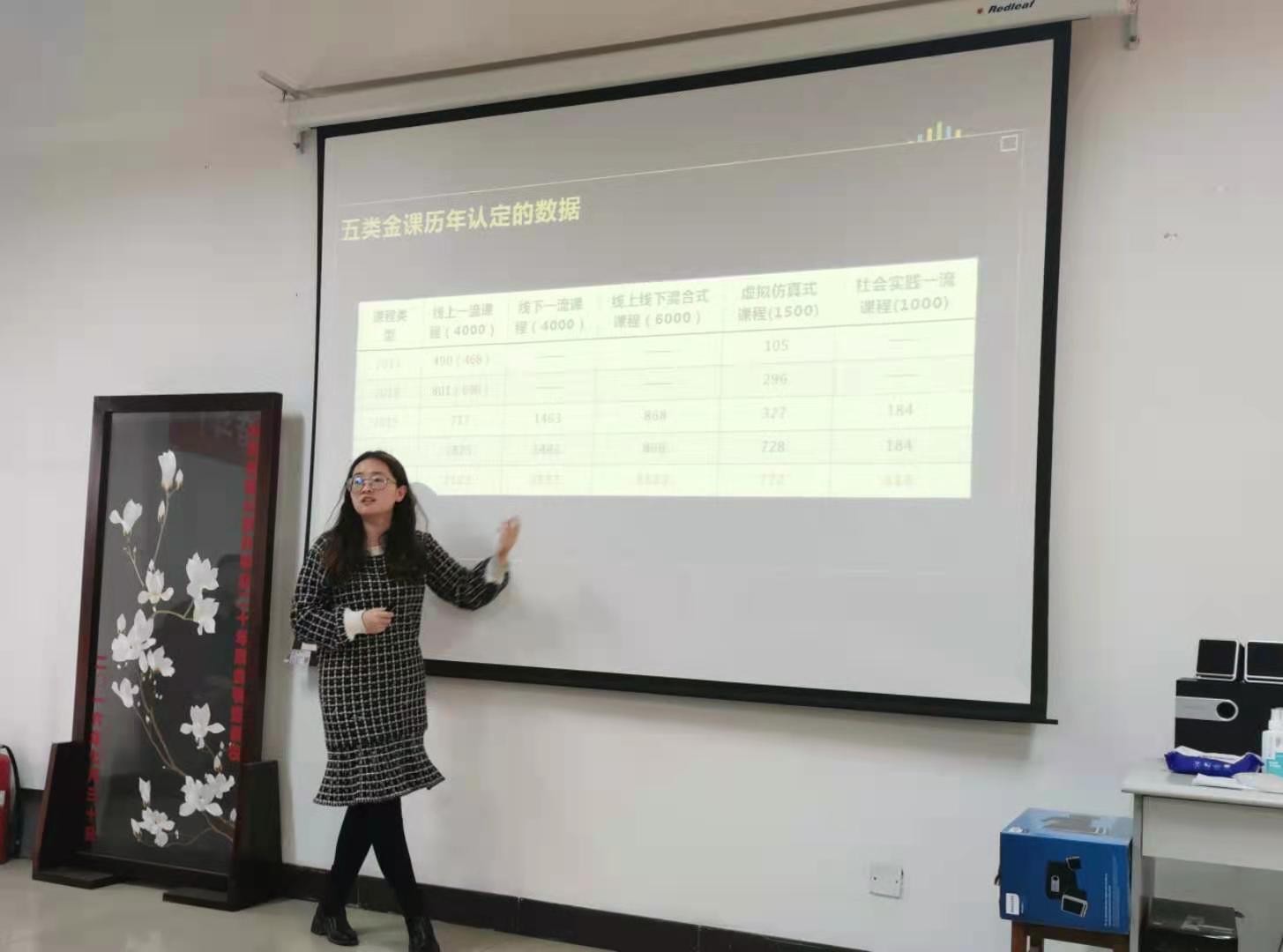 会议开始后,闫春副院长首先介绍了会议的主题和目的。然后,智慧树网高级课程顾问侯云娥分别从国家一流课程建设的背景、目标、要求、申报策略等方面对相关政策和精神做了解读,并分析比较了一些与我院各专业主干课程关联性强、建设水平高、已经获得立项的国家级一流课程建设经验。之后,与会老师分别就自己感兴趣的话题与课程顾问开展互动交流。最后,卫虎林院长做总结讲话,认为本次培训的形式和效果都很好,对于促进学院获得立项的国家级和省级一流课程建设,做好“十四五”期间,尤其是今年的一流课程建设规划具有积极的作用,要求各专业和教研室以课程教学团队建设为抓手,打造优质课程,提高人才培养质量,为专业建设和学科发展提供有力支撑。(供稿人闫春、王霞)