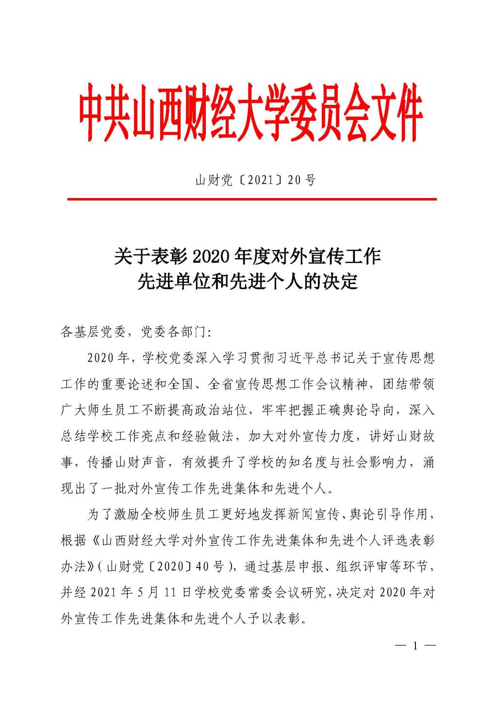 2020 年,学院党委团结带领广大师生员工不断提高政治站位,牢牢把握正确舆论导向,深入总结学院工作亮点和经验做法,讲好山西财大工商故事,传播山西财大工商声音,加大对外宣传力度,有效提升了学院的知名度与社会影响力。