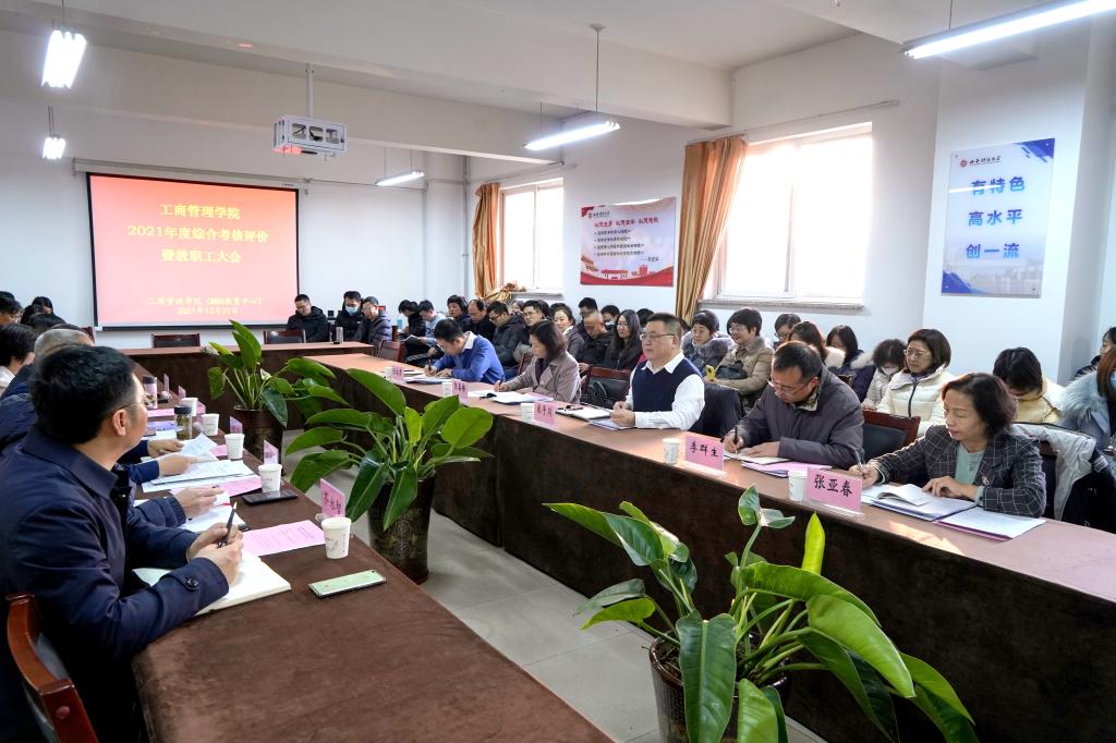 学院院长卫虎林按照年初学校下达的目标总体任务,从2021年学院工作回顾、明年工作思路与重点工作两个方面作了汇报。一年来,学院全面实施推进一流专业建设行动计划、一流课程建设行动计划、标志性成果突破和社会服务行动计划、案例开发与建设行动计划、积极推进商科国际认证行动计划等“五大行动计划”,完成了学校目标任务书的主要内容,学院“十四五”高质量发展实现良好开局。在人才培养、科学研究、师资队伍、专业建设与教学、对外合作交流与社会服务、对外宣传等多个方面,都有新的亮点。第一,学院四个本科专业实现省级以上一流专业全覆盖,工商管理、市场营销获得国家一流专业建设点。第二,教学研究获得新的突破。获得教育部新文科建设项目1项,教育部产学研合作协同育人项目2项,获得2021山西省教学成果特等奖一项。首届国家教材奖获得一个一等奖,一个二等奖。新增省级一流课程一门。第三,科研项目有新发展。获得国家自科基金项目1项,教育部人文社科项目3项,省级科研项目29项。获得科研经费390.63万元。获得山西省科技进步二等奖1项。第四,高层次人才引进取得新成绩。引进或学校内部调整新增博士7人,具有博士学位教师达到51人,占比为60.7%。第五,对外合作交流继续稳步推进。新建校外实践基地10个,与山西省经建投集团开展了深度合作。第六,案例开发与建设工作取得新成绩。圆满举行“长城电气杯”管理案例大赛。第七、我校MBA荣获“2021年度中国商学院最佳MBA项目TOP100”奖,荣获“2021年度中国商学院卓越运营奖”。在第十二届“全国百篇优秀管理案例”中获得2篇百优案例。第八、高标准完成学校70年校庆学院层面“五个一批”系列活动,成立了MBA校友会。第九、对外宣传工作取得新的成绩,中国国际电视台、科技日报、山西日报、山西电视台、山西新闻网、黄河新闻网、太原电视台等主流媒体,对我院相关报道十余次。