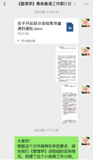 6月23日,创建了“《管理学》课程集体备课工作群”。其中,8位在课程建设中深度参与、熟悉内容体系、非常有责任心且新学期有教学任务的老师作为主讲教师,承担后续集体备课研讨会上的说课任务;6位在近几年《管理学》教学任务虽少,但教学管理及教学实践经验丰富、在课程建设中亲历《管理学》成为省级精品课程、学校首批慕课、首批省级线上精品共享课程、首批国家级线上线下混合式一流课程、省级首批课程思政示范课程等各个重要建设阶段、非常有热心的教师,主要负责建言把关。通过组织学习领会文件精神,大家明确了集体备课的重要意义、具体要求、主要内容及实施方式等,特别强调了马工程教材的使用与课程思政的设计,制定了具体工作计划时间表和任务图,统筹安排,责任到人,分工协作。
