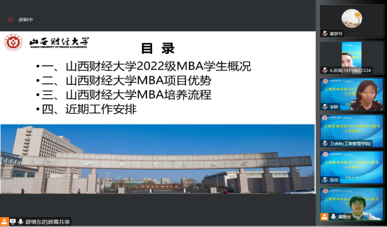 应疫情防控要求,我院2022级MBA新生入学教育通过线上腾讯会议进行。9月17日晚上19:30,学院领导班子全体成员、MBA教育中心全体工作人员、2021级班主任、2022级班主任和2022级MBA新生参加了会议。会议由学院党委书记高岳主持。