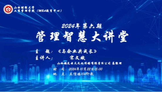 10月22日下午,我院在立信楼104阶梯教室举办2024年第六期“管理智慧大讲堂”。本次活动邀请了优秀校友、太原市迎泽区第六届人大代、山西领先云天文化传媒有限责任公司总经理宋文斌先生作了题为“与企业共成长”的专题讲座。讲座由学院党委副书记周志刚主持,年级辅导员及2023级全体本科生200余人参加。