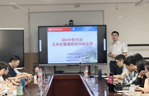 关鑫教授围绕“QCA分析方法及其在管理研究中的应用”这一主题,从QCA方法的基本介绍、分类和应用三个方面展开报告。关教授首先从QCA方法的提出背景、概念界定以及理论基础切入,强调了QCA具有组态思维、等效性和非对称性的特点。其次,关教授将QCA与其他分析方法进行对比,得出其优势和局限性。接着,关教授详细阐述了QCA方法的三个主要分类,包括清晰集定性比较分析(csQCA)、多值定性比较分析(mvQCA)和模糊集定性比较分析(fsQCA)。最后,关教授通过两篇论文展示了QCA方法在管理研究中的应用,加深了师生们对QCA方法的认识。在互动环节中,学院师生积极提问交流,关鑫教授逐一耐心解答。