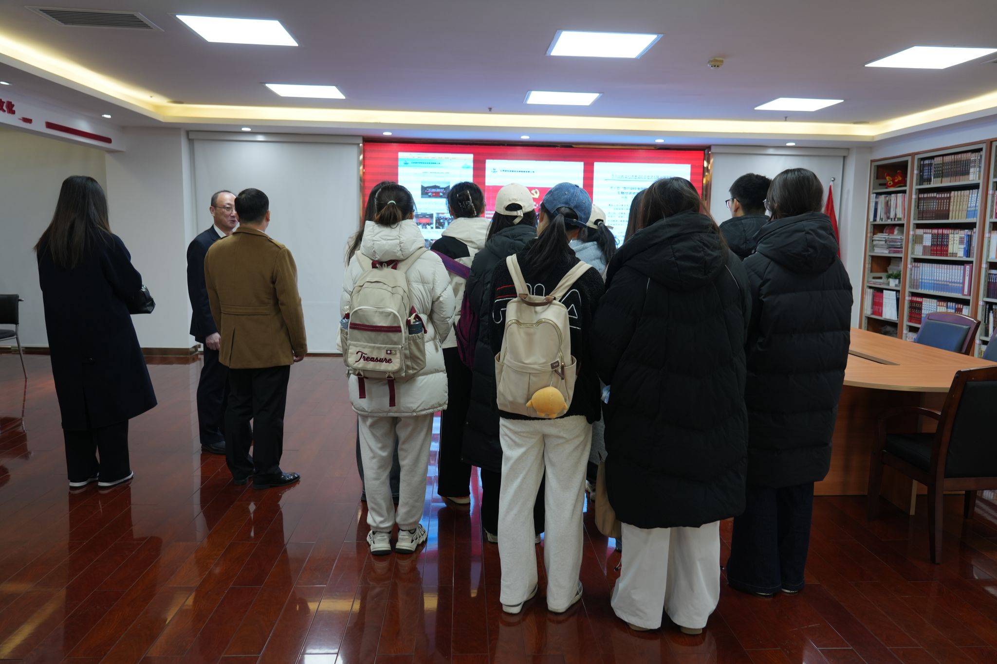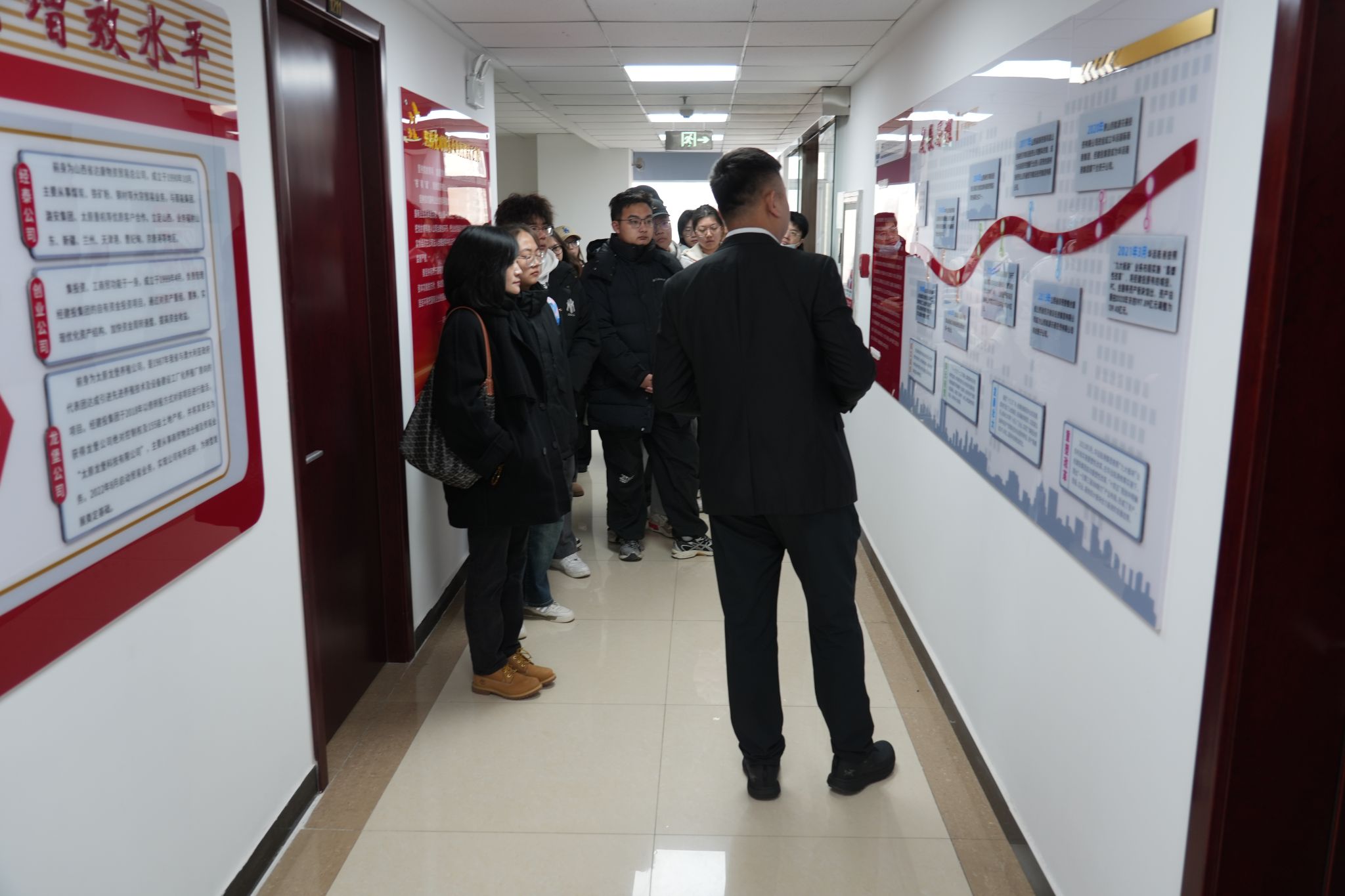 参观环节中,经建投讲解员带领我院师生分三批对集团各部门、文化墙、产品样品陈列进行了参观、介绍,并观看了企业宣传片。同学们对于经建投集团的发展历程、四大业务板块、业务的发展与转型、党建工作、工会荣誉以及我院与经建投校企合作的历史有了较为直观的认识。
