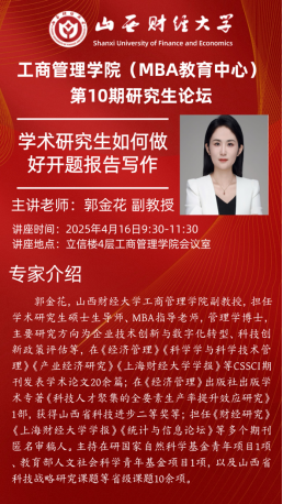 4月16日上午,我院在立信楼学院会议室举办了第10期研究生论坛。学院郭金花副教授为我院学生作了题为“学术研究生如何做好开题报告写作”的讲座,我院硕士研究生共40余人参加。