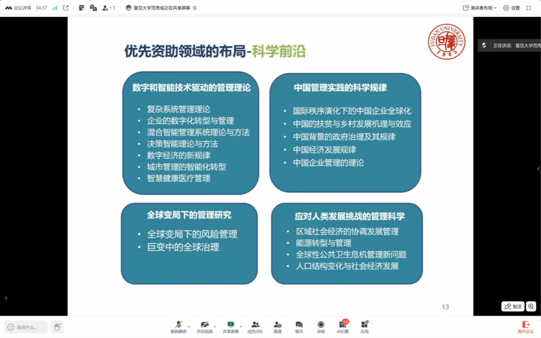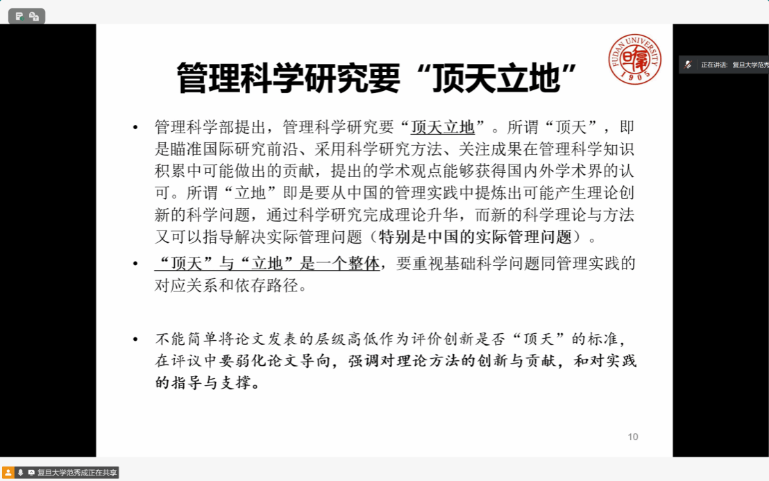 范秀成教授首先回顾了自科基金的发展历程与定位,强调“支持基础研究,坚持自由探索,发挥导向作用”的宗旨。重点指出,管理科学部的项目申请需注重“顶天立地”的研究取向:既要瞄准国际学术前沿,聚焦理论创新,也要扎根中国管理实践,从现实问题中凝练科学问题,形成兼具理论价值与实践意义的课题设计。