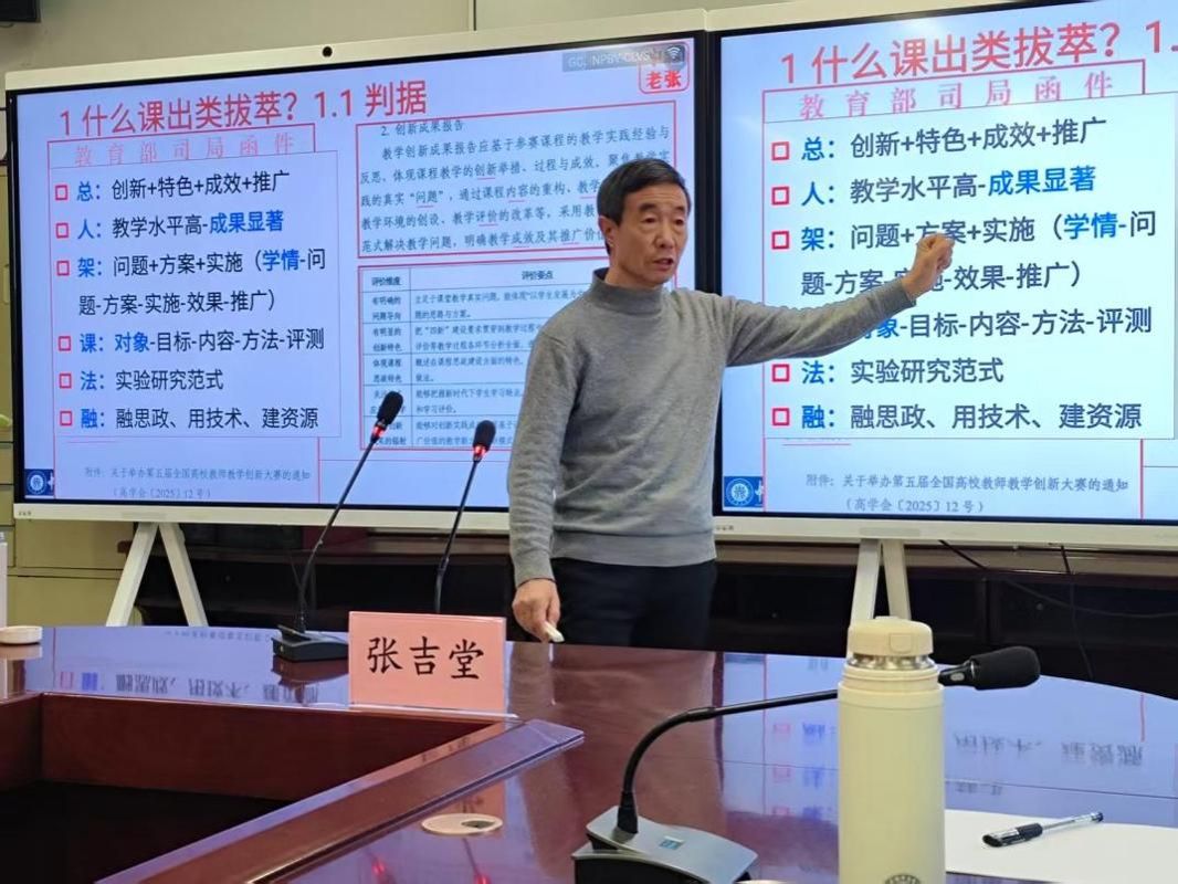 张吉堂教授以“乐教、爱教、思教”的自我简介开场,以其一贯的生动与幽默,迅速拉近了与在场教师的距离。他指出,一门真正“出类拔萃”的课程,应从课程与教师两个维度进行衡量:课程本身须体现“创新、特色、成效和推广”的完整闭环;而教师则需具备“有心、有果”的持续投入与可见成果。这一双重标准的提出,为教师自我定位与课程建设指明了清晰方向。
