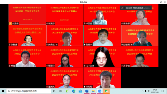 5月21日下午,必威西汉姆官网平台2022届学术硕士学位论文答辩在线上(腾讯会议)举行。我院企业管理专业23名同学,技术经济及管理专业6名同学,人力资源管理专业8名同学,共37人参加了学位论文答辩。答辩主席由太原理工大学、华北水利水电大学、太原科技大学、运城学院教授或行业专家担任。