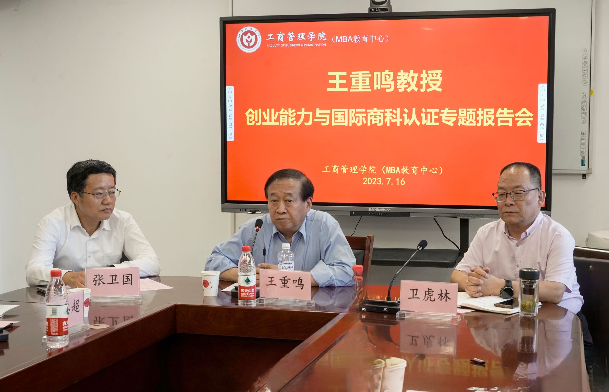 7月16日下午,浙江大学文科资深教授,浙江省特级专家,浙江大学管理学院教授、博士生导师,国际丝路创业教育联盟理事长,AMBA&BGA商学院国际认证协会国际顾问委员会中国代表王重鸣,应邀在我院做创业能力与国际商科认证专题报告。校党委常委、副校长张卫国应邀出席会议。学校发展规划部负责人,学院领导班子全体成员、各教研室主任、国际认证团队成员、近五年新入职博士、MBA教育中心所有工作人员等50余人参加会议。会议由学院院长卫虎林主持。