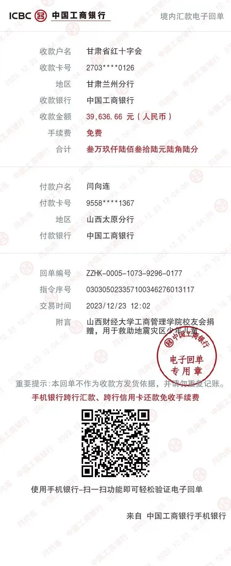 12月18日23时59分,甘肃临夏州积石山县发生6.2级地震,造成重大人员伤亡和财产损失,灾情牵动着亿万国人的心。地震无情,人间有爱,一方有难,八方支援。危急时刻,必威西汉姆官网平台卫虎林院长第一时间向校友会及广大校友发出倡议,为灾区捐献爱心,以实际行动帮助灾区群众恢复生产生活,重建家园。校友会向甘肃红十字会捐款共计39,636.66元。