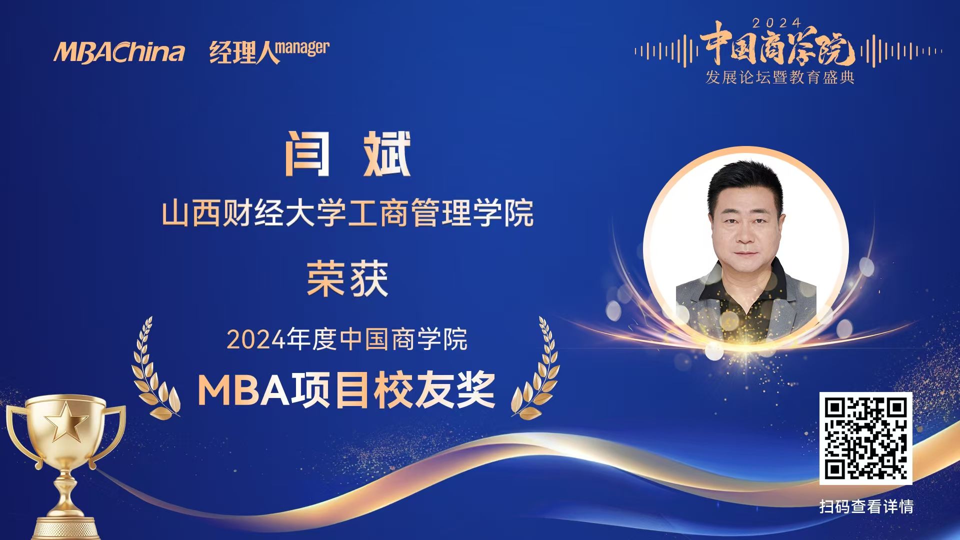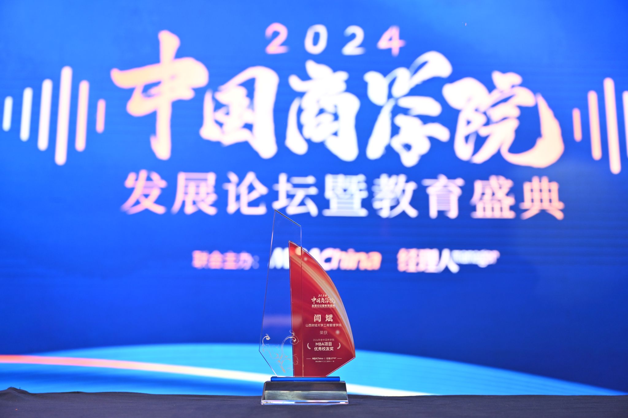 11月29日,由MBAChina和《经理人》杂志联合主办的“2024年度中国商学院发展论坛暨教育盛典”在北京召开。本次盛典揭晓并颁发了2024年度中国商学院最佳MBA项目等系列重磅奖项榜单,向榜样致敬,共同见证荣耀时刻。我校EMBA校友、MBA校外导师、山西海之韵信息技术有限公司董事长闫斌,凭借其在企业创新发展中的卓越贡献和商业领导力方面的杰出表现,荣获“2024年度中国商学院MBA项目优秀校友奖”。