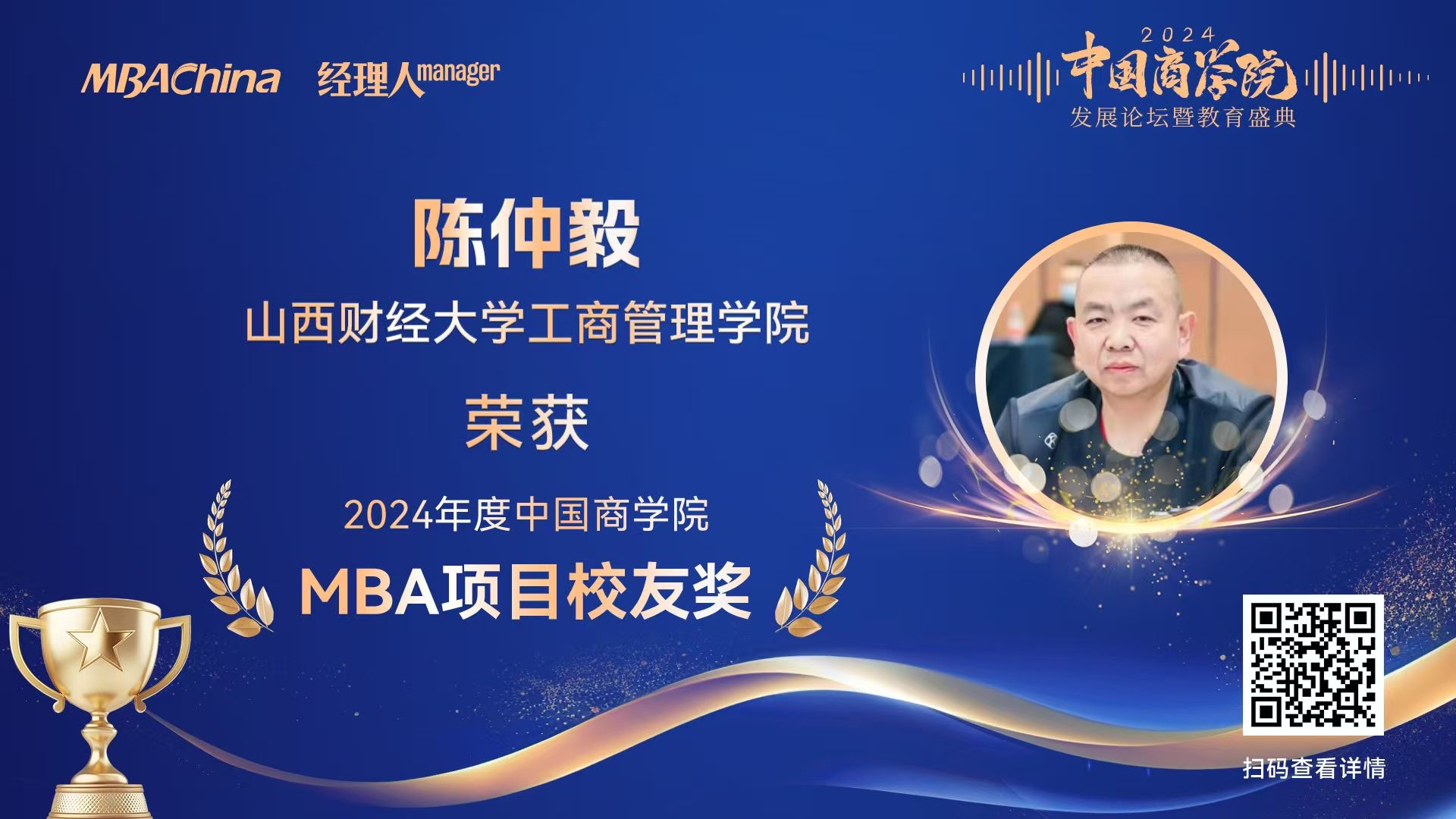 11月29日,由MBAChina和《经理人》杂志联合主办的“2024年度中国商学院发展论坛暨教育盛典”在北京召开。本次盛典揭晓并颁发了2024年度中国商学院最佳MBA项目等系列重磅奖项榜单,向榜样致敬,共同见证荣耀时刻。我校EMBA校友、必威西汉姆官网平台校友会会长、山西毅圣数智消防股份有限公司董事长陈仲毅,以其卓越的领导力、持续的创新精神和对社会的杰出贡献,荣获“2024年度中国商学院MBA项目优秀校友奖”。