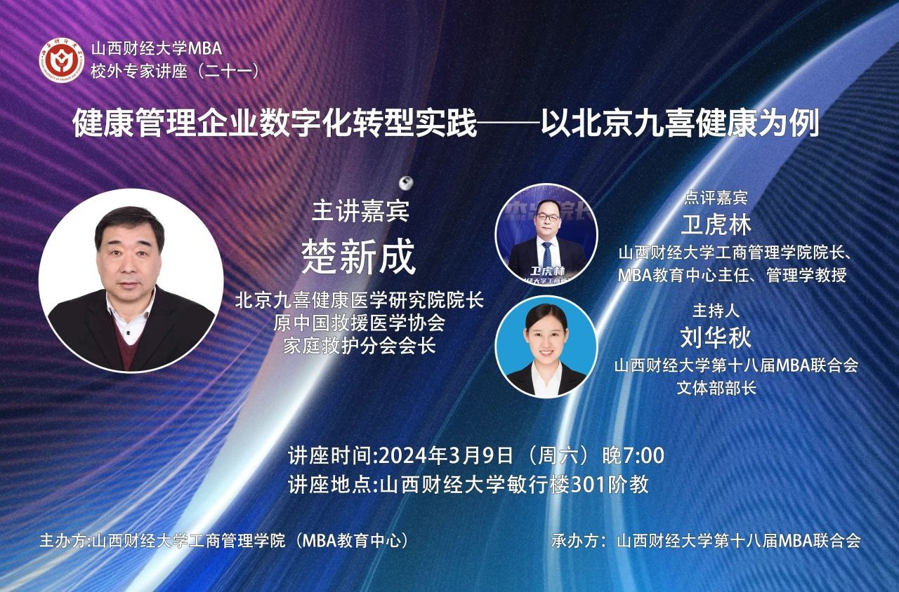 3月9日晚,由西汉姆联必威西汉姆官网平台主办、西汉姆联第十八届MBA联合会承办的西汉姆联MBA校外专家系列讲座(第二十一期)在敏行楼301阶教成功举办,同时在腾讯会议上进行了线上直播。本期特邀北京九喜健康医学研究院院长楚新成带来题为“健康管理企业数字化转型实践——以北京九喜健康为例”的专题讲座,2023级MBA学员、部分MBA教师、线上线下共300余人参加了讲座,本期讲座还得到了MBAChina网站的同步转播。