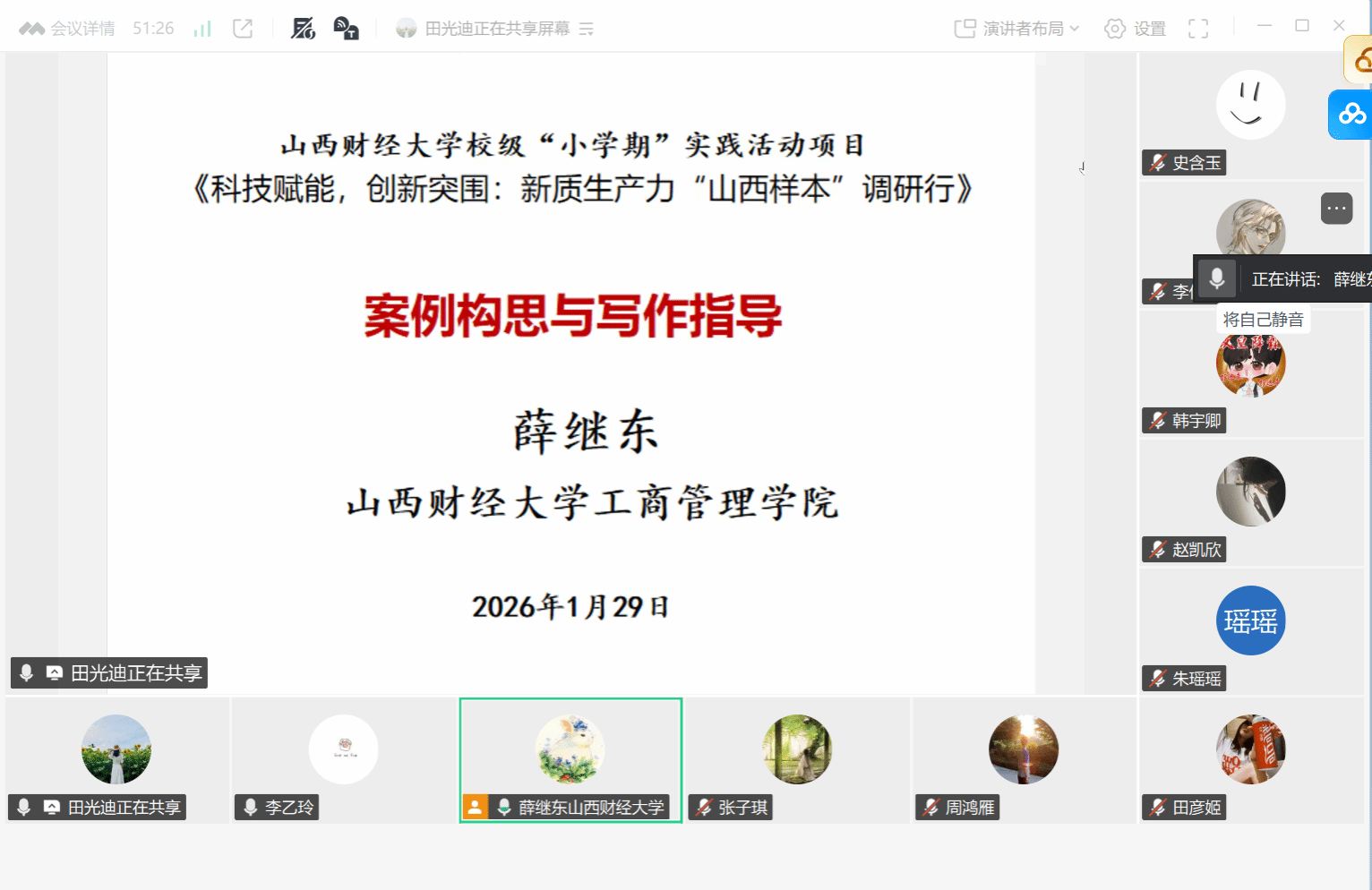 为扎实推进校级小学期实践项目落地,固化新质生产力“山西样本”调研成果,提升学生案例开发与学术写作能力,1月29日上午,由我院副院长薛继东教授牵头组织的小学期实践项目案例写作指导研讨会在线上召开。本次研讨会以福莱瑞达物流设备科技有限公司、山西杏花村汾酒集团有限责任公司两家企业为案例样本,聚焦调研成果转化,为参与调研的学生提供指导,30余位师生参会。