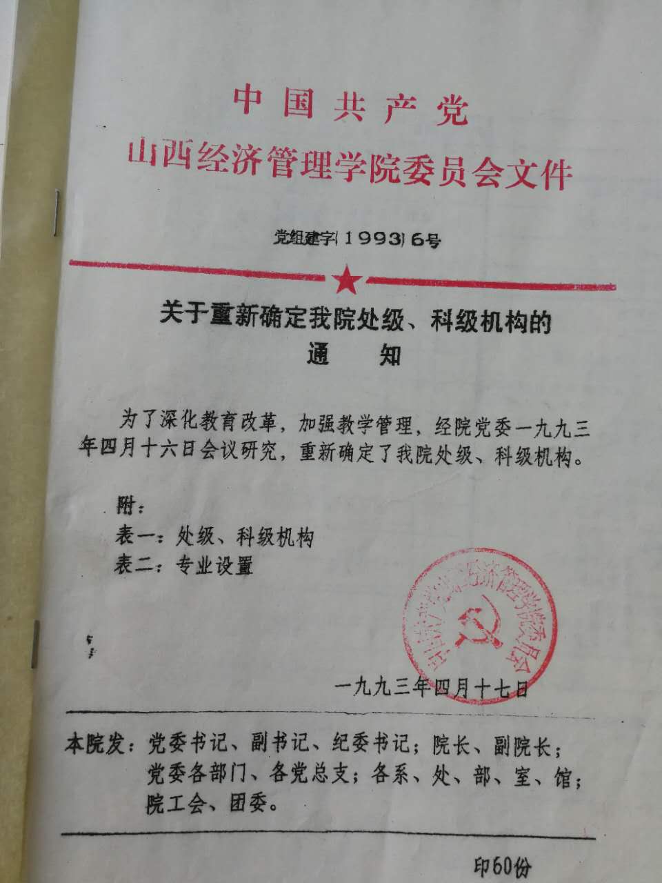 1993年4月,原山西经济管理学院的国民经济管理系更名为市场学系,下设工业企业管理专业(4年制本科)、劳动经济学专业(4年制本科)、市场营销学专业(4年制本科)、证券学专业(4年制本科)、市场营销学专业(2年制专科)。