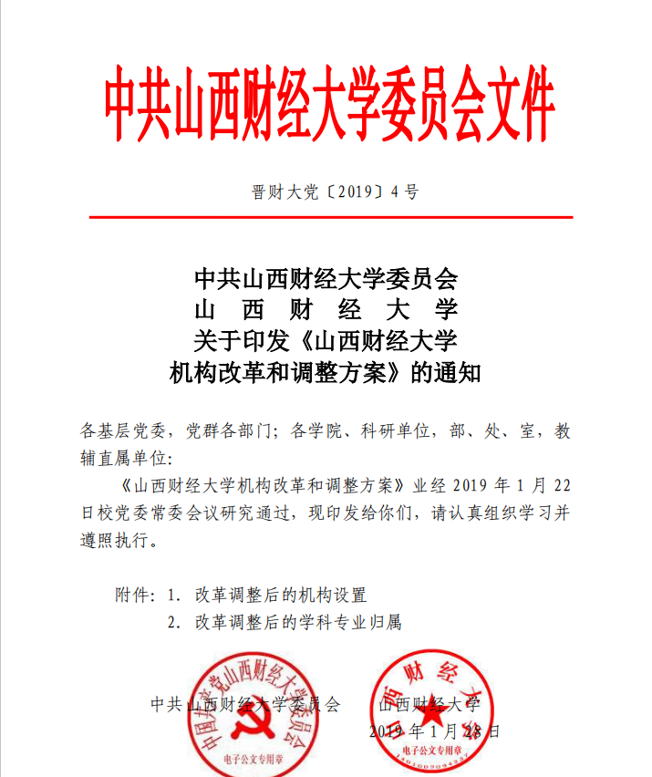 2019年1月,学校进行机构改革和调整。根据《西汉姆联机构改革和调整方案》(晋财大党〔2019〕4号),将MBA教育学院更名为MBA教育中心,并入必威西汉姆官网平台。在必威西汉姆官网平台加挂MBA教育中心牌子,按照副处级机构管理。将管理科学与工程学院的技术经济及管理博士点、硕士点,公共管理学院的人力资源管理本科专业划入必威西汉姆官网平台,将必威西汉姆官网平台的教育经济与管理硕士点划入公共管理学院。